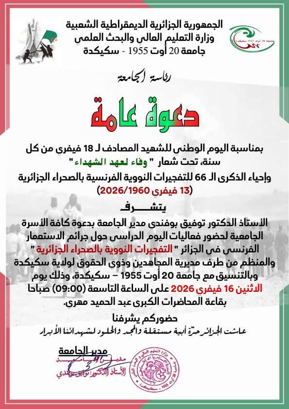 يتشرف الأستاذ الدكتور توفيق بوفندي مدير الجامعة بدعوة كافة الأسرة الجامعية لحضور فعاليات اليوم الدراسي حول جرائم الاستعمار الفرنسي في الجزائر " التفجيرات النووية بالصحراء الجزائرية " والمنظم من طرف مديرية المجاهدين وذوي الحقوق لولاية سكيكدة بالتنسيق مع جامعة 20 أوت 1955 - سكيكدة، وذلك يوم الاثنين 16 فيفري 2026 على الساعة التاسعة (09:00) صباحا بقاعة المحاضرات الكبرى عبد الحميد مهري.