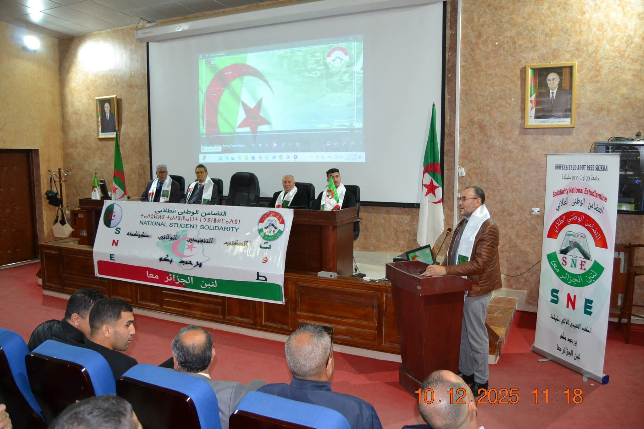 في إطار الإحتفالات المخلدة للذكرى الخامسة والستون لمظاهرات الشعب 11 ديسمبر 1960 المجيدة ضد الإستعمار الفرنسي الغاشم ، نظم صبيحة يوم الأربعاء 10 ديسمبر 2025 بقاعة المحاضرات مجمع مسعود بوقادوم التضامن الوطني الطلابي المكتب الولائي سكيكدة SNE_Skikda بالتنسيق مع نادي الذاكرة والتراث ذكرى تاريخية بمناسبة مظاهرات 11 ديسمبر 1960 تحت شعار إنتفاضة شعب ، حيث أشرف نائب المدير المكلف بالبيداغوجيا ا.د مطاطلة عبد الرزاق نيابة عن السيد مدير الجامعة البرفيسور بوفندي توفيق على إفتتاح فعاليات هذا النشاط التاريخي ، رفقة رئيس المكتب الولائي SNE Skikda و الأسرة الثورية