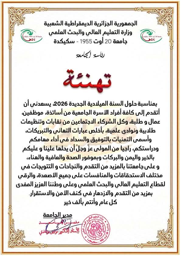 Université 20 août 1955 BP 26. Route d'El Hadaiek - Skikda 21000 – Algérie