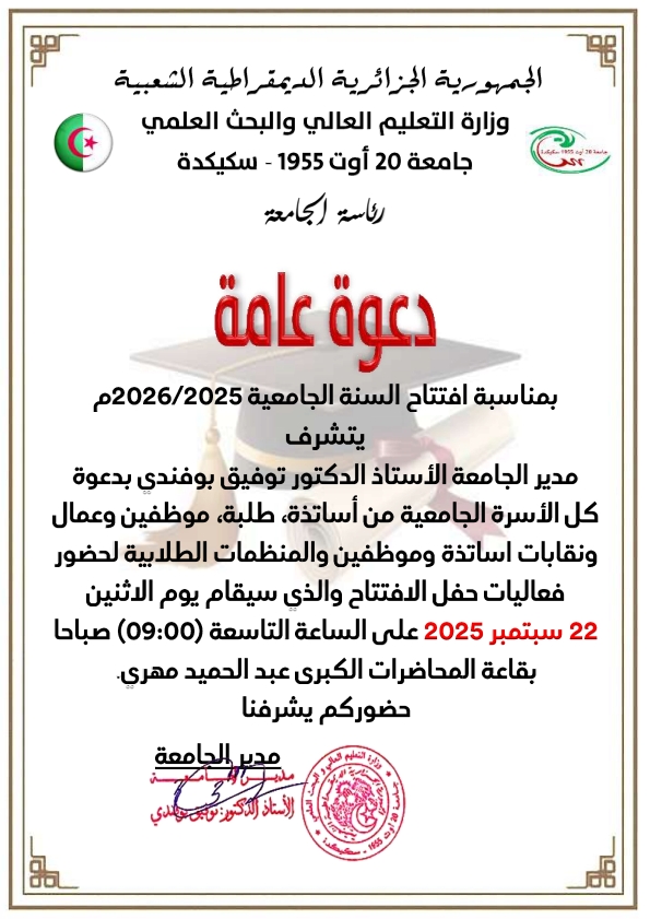 يتشرف السيد مدير الجامعة البرفيسور بوفندي توفيق بدعوة كافة أفراد الأسرة الجامعية لحضور فعاليات حفل الإفتتاح والذي سيقام يوم الإثنين 22 سبتمبر 2025 على الساعة التاسعة صباحا 09:00 بقاعة المحاضرات الكبرى عبد الحميد مهري .