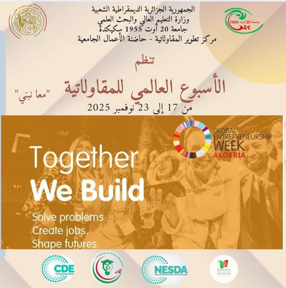 يتشرف السيد مدير جامعة 20 أوت 1955 سكيكدة البروفيسور بوفندي توفيق بدعوة كافة أفراد الأسرة الجامعية لحضور فعاليات افتتاح الأسبوع العالمي للمقاولاتية، الذي تنظمه جامعة سكيكدة من 17 نوفمبر إلى 23 نوفمبر 2025 تحت شعار: " معا نبني" بالتنسيق مع واجهات الجامعة: مركز تطوير المقاولاتية ، حاضنة الأعمال الجامعية ومركز دعم التكنولوجيا والابتكاروذلك يوم الاثنين 17 نوفمبر 2025 ، ابتداءً من الساعة التاسعة ونصف صباحا بقاعة المحاضرات المكتبة المركزية