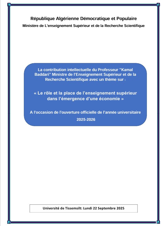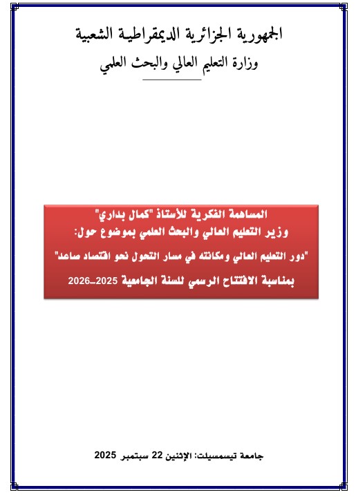 المساهمة الفكرية للأستاذ "كمال بداري" وزير التعليم العالي والبحث العلمي بموضوع حول:"دور التعليم العالي ومكانته في مسار التحول نحو اقتصاد صاعد" بمناسبة الافتتاح الرسمي للسنة الجامعية 2025- 2026 والتي ألقاها من جامعة "أحمد بن يحي الونشؤيسي" - ولاية تيسمسيلت